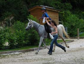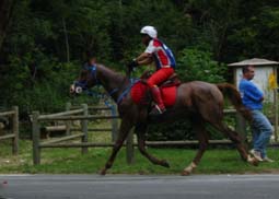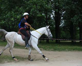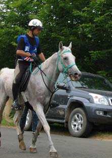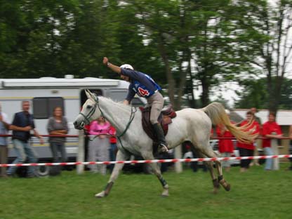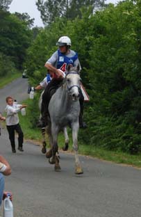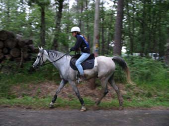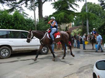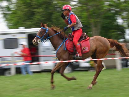 ![]() Farhoz de paute et Céline Scwartz repartent en 3ème postion du dernier Vet Gate, derrière Piacenza et Geruan parti en 2ème position. Geruan rattrape Piacenza , la dépasse, et entre seul sur l'hippodrome de Monpazier. |